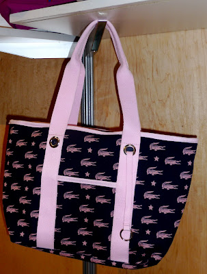 A batch of retro sports beach bags and a special “Breast Cancer” bag ($100) in a cool croc pink/navy allover pattern…rounds out the collection.