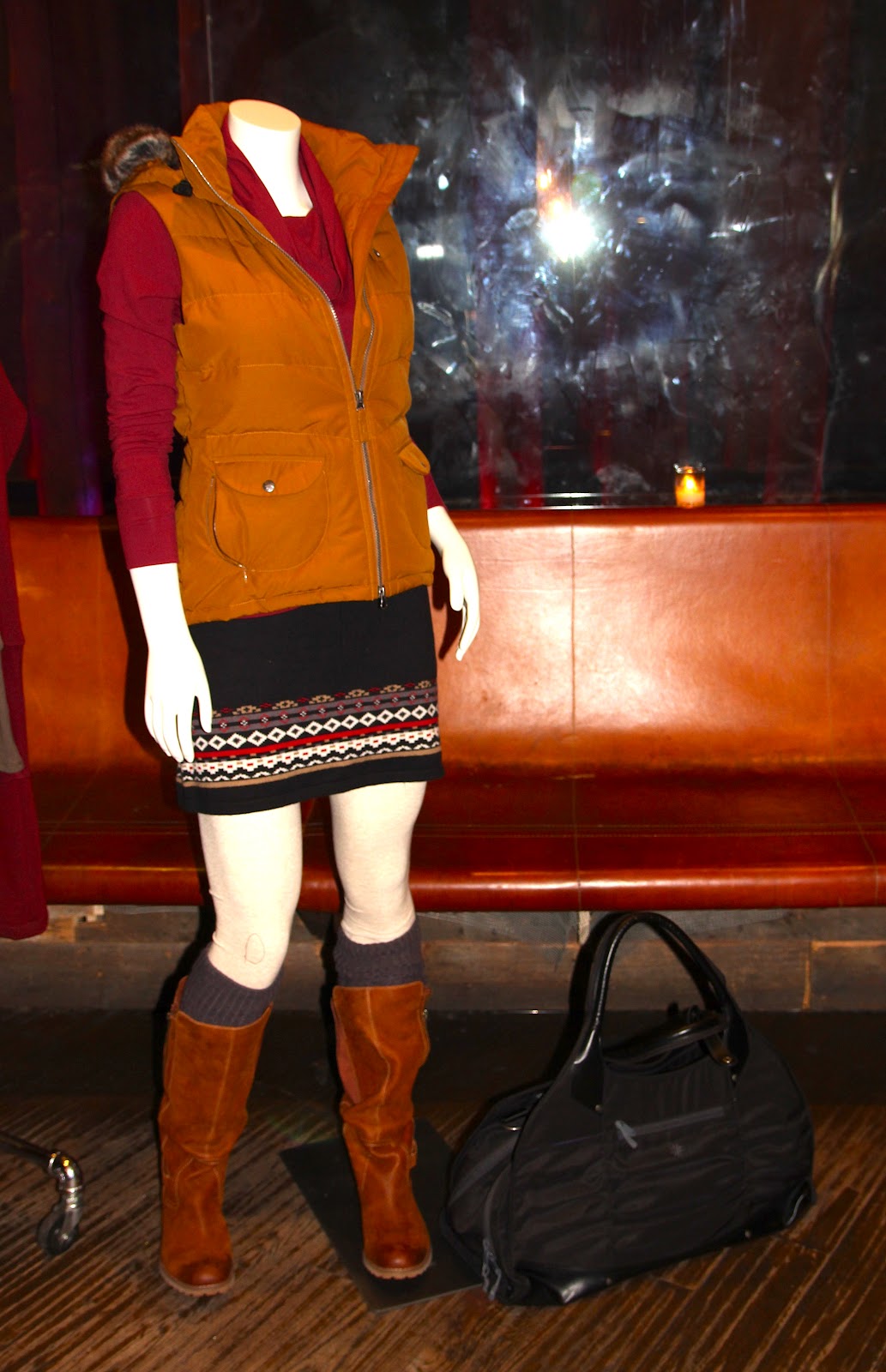 | A casual winter uniform-scandic print dasher skirt- mini skirt with drawstring waist, layered w/-l/s lupin top $69 w/cowl neck in port wine-super soft sueded Tactel® dries 8x faster cotton, down lake shore vest-in golden maple $158 removable hood,/faux fur trim (other colors available), boots... |