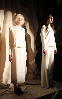 Brooklyn based designer Suzanne Rae Palaez looked to the service industry for inspiration in a sartorially sense---a dedication "that involves giving aid to those in need; to serve the greater good that is humanity....the modest clothing of missionary monks, priests and nuns...the silhouettes and linear geometry of their robes..."