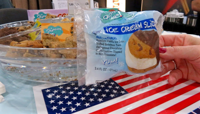 | FATBOY COOKIES' Joel's Outrageous uses their 100% all natural fresh chocolate chunk frozen cookie dough mad with real butter- (no trans fat, Kosher-Dairy)- for a chewy richness sandwich + premium vanilla ice cream with chocolate icing= Ice Cream Sliders. |